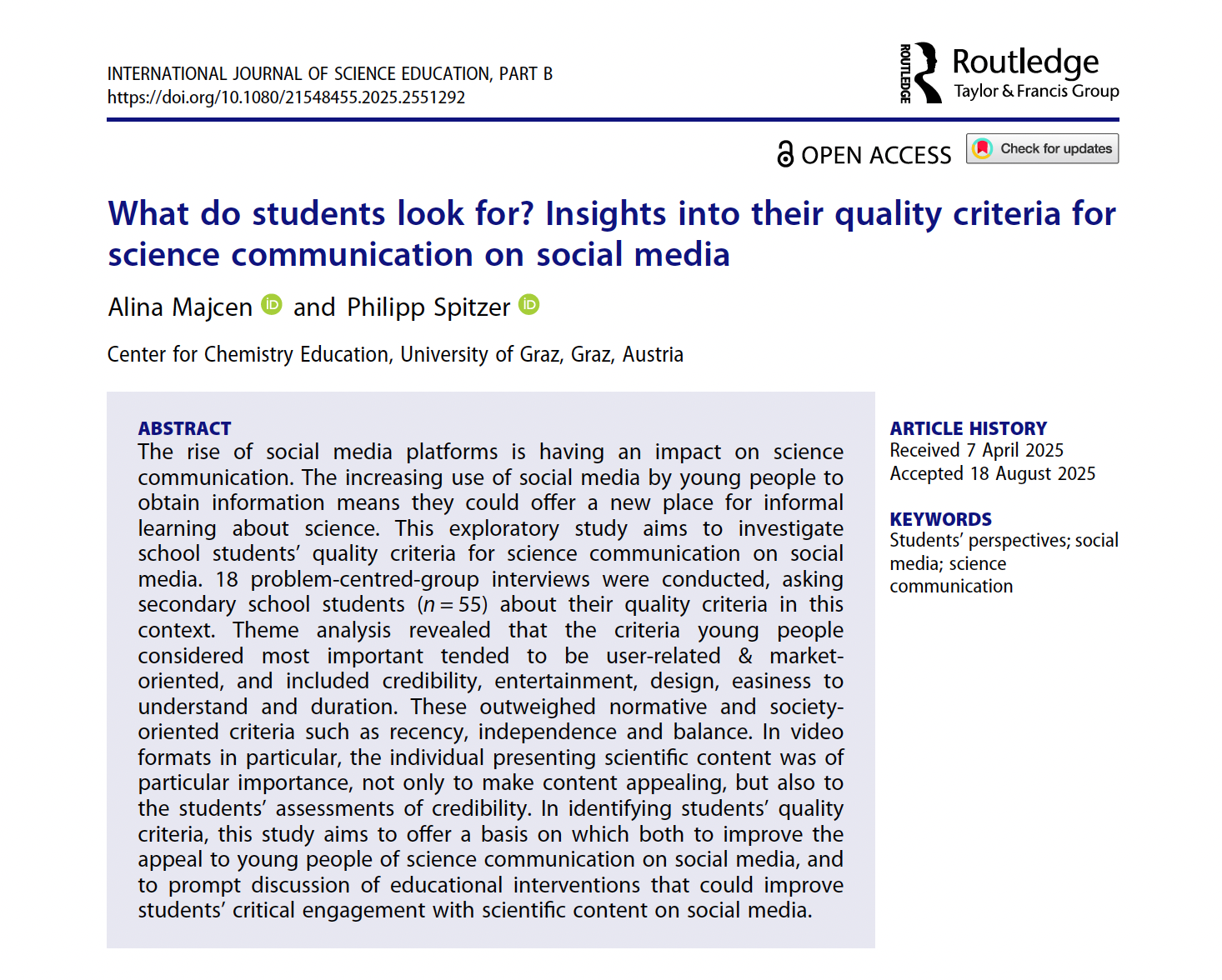 Der Artikel mit dem Titel "What do students look for? Insights into their quality criteria for science communication on social media" untersucht, welche Aspekte für Jugendliche besonders wichtig sind, wenn sie wissenschaftliche Inhalte online konsumieren.